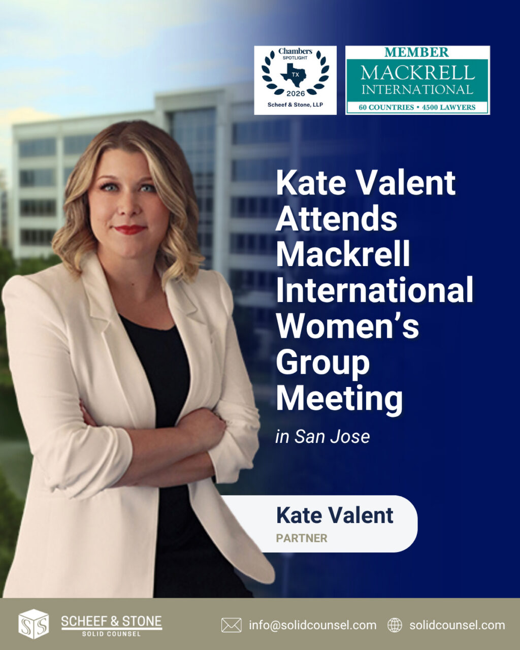 Scheef & Stone, LLP is pleased to share that Partner Kate Valent attended the Mackrell International Women’s Group Meeting held March 19–20, 2026, in San Jose, California.